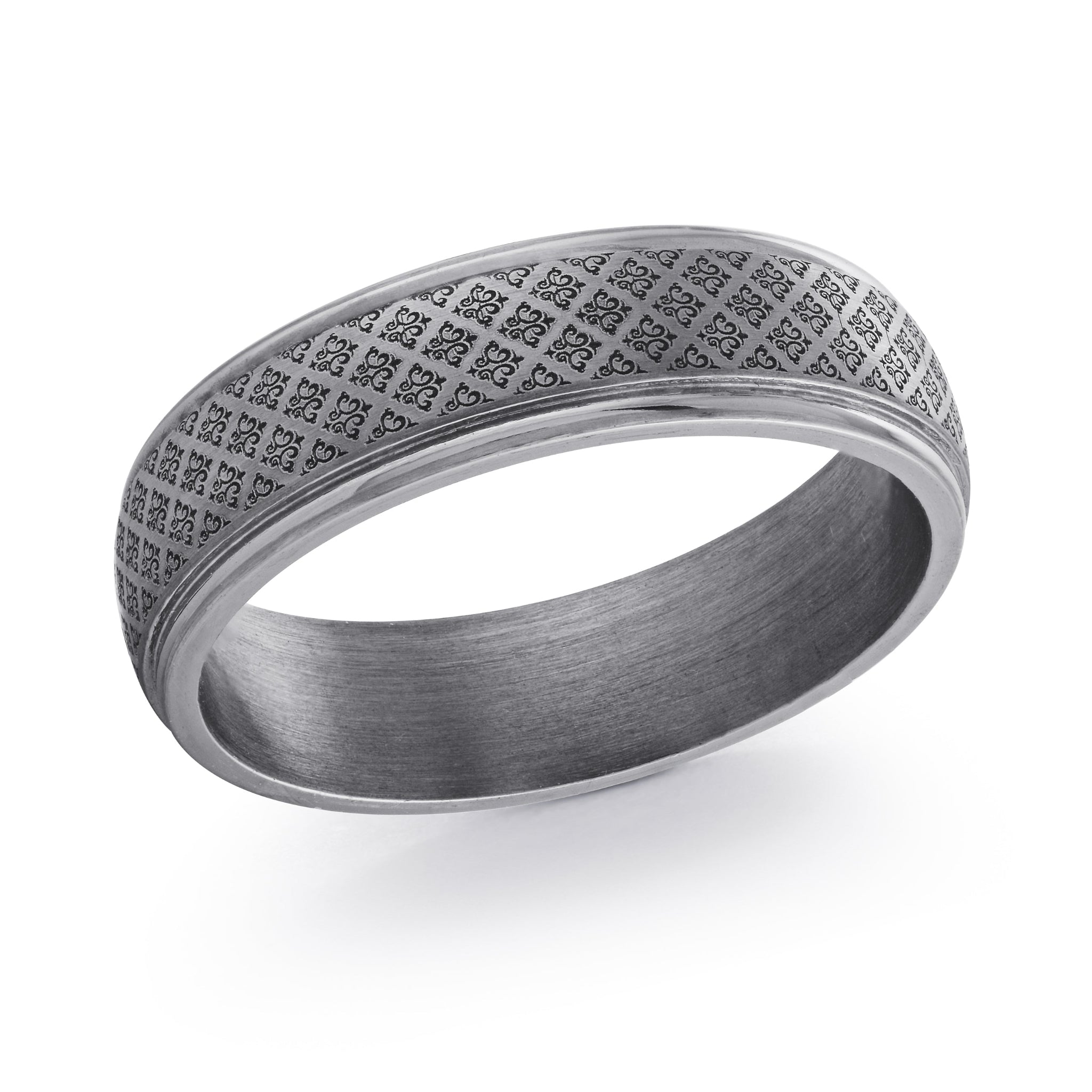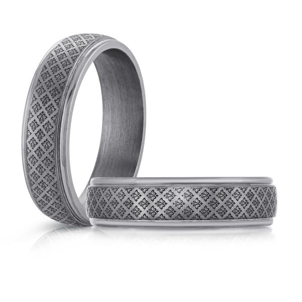 Premium Tantalum Men's Wedding Band with Laser Engraved Ornament and Polished Stepped Edges - 6mm Width