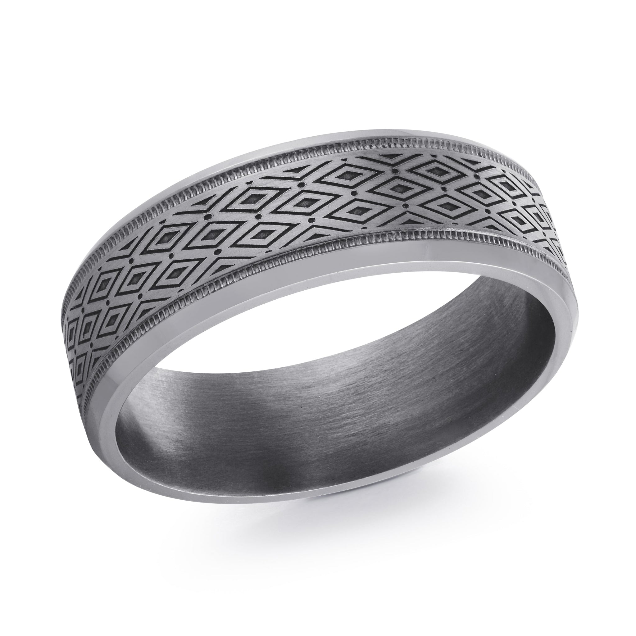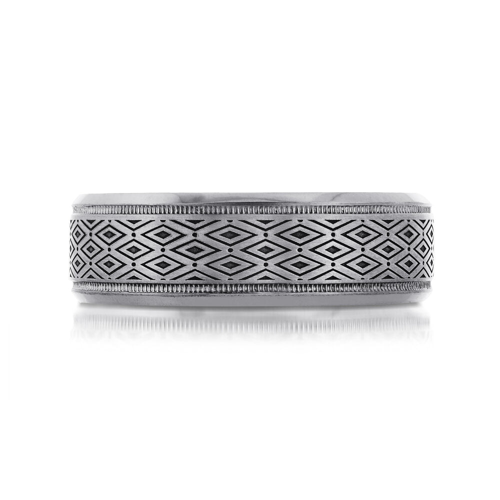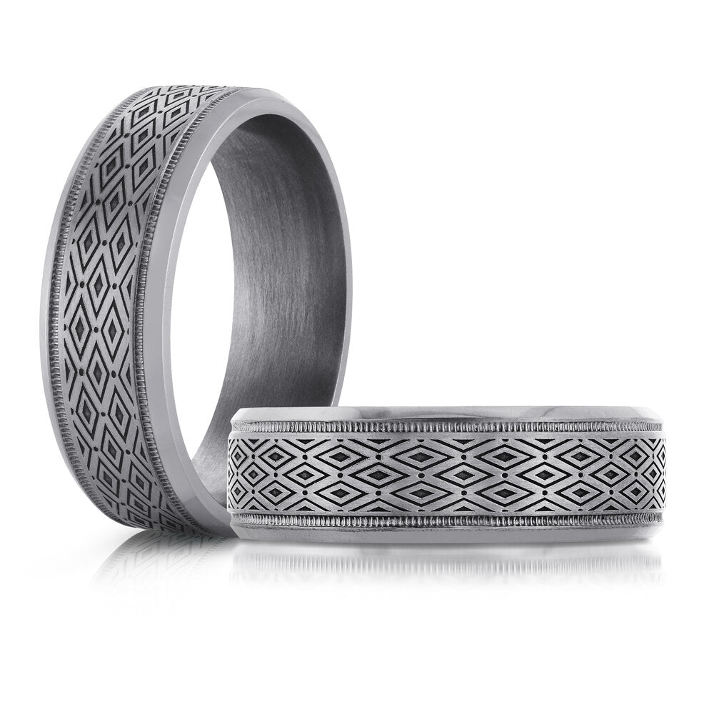 Tantalum Men's Wedding Band with Laser Engraved Geometric Pattern and Mill Grained Beveled Edges - 7mm Width