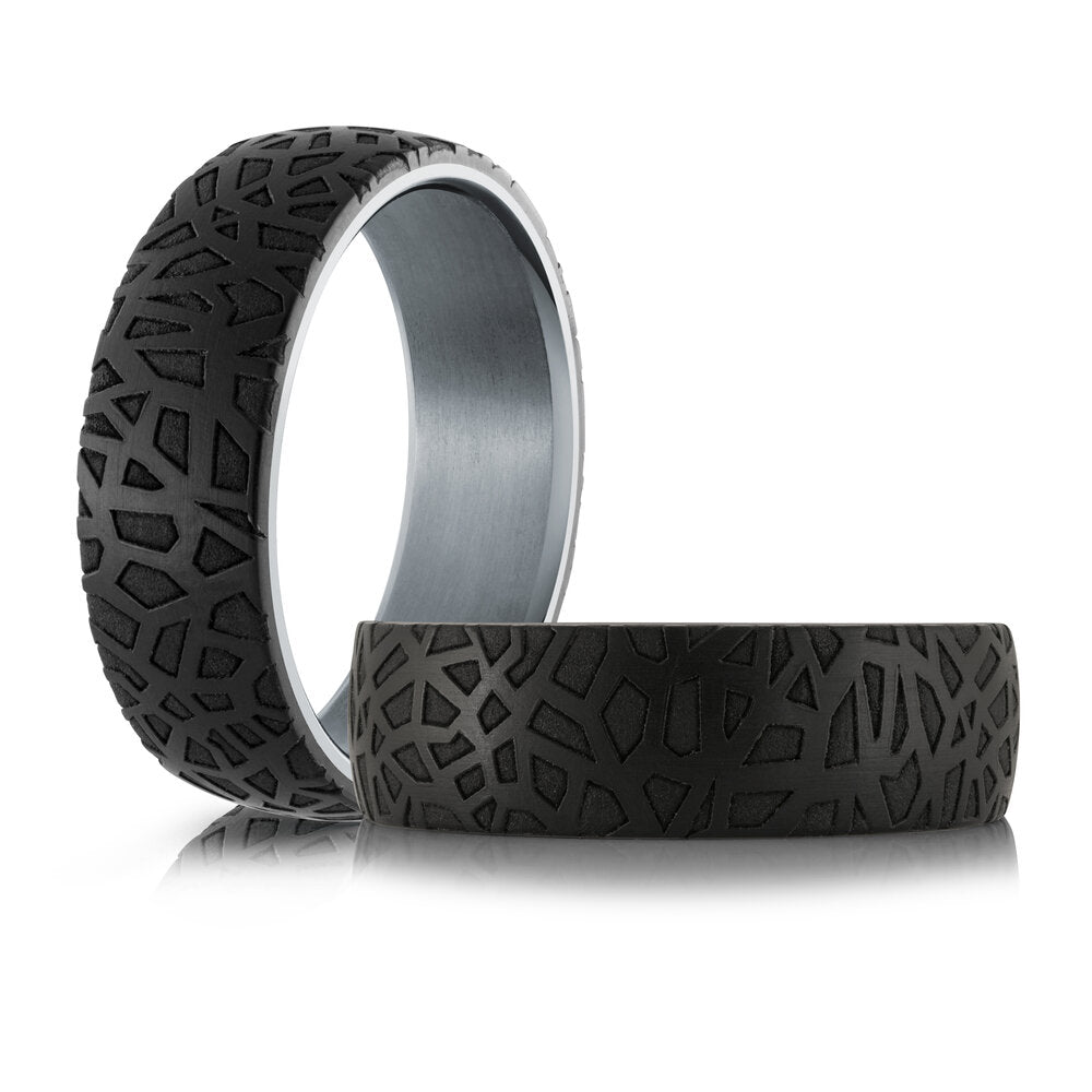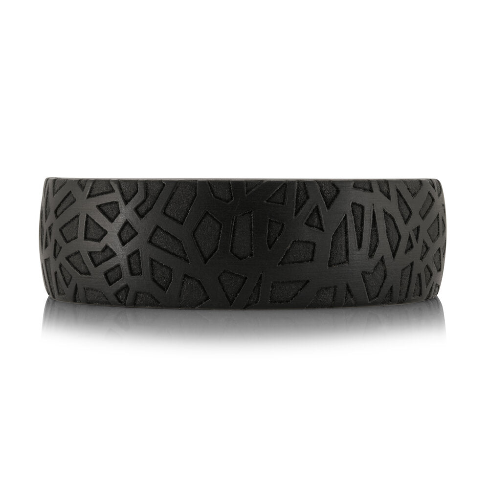 The Nightvein is carbon fiber outside, tantalum inside at 7mm. That geometric pattern gets cut right into the carbon - looks like tire tread or something broken up. Wild looking if you're into cars or think regular wedding rings are boring.